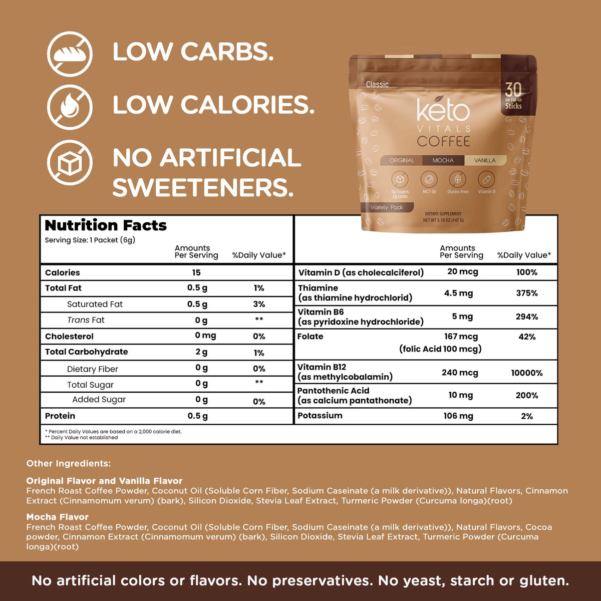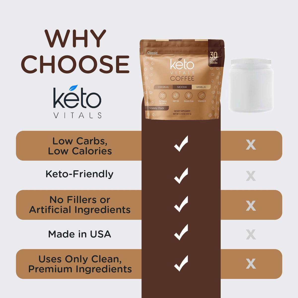 - Creamy and Versatile - More than just a regular cup of joe, KetoVitals’ keto instant coffee amps up your favorite beverages. Add a keto coffee packet to your shake, smoothies, or desserts. Or just add ice to make a refreshing glass of iced coffee!