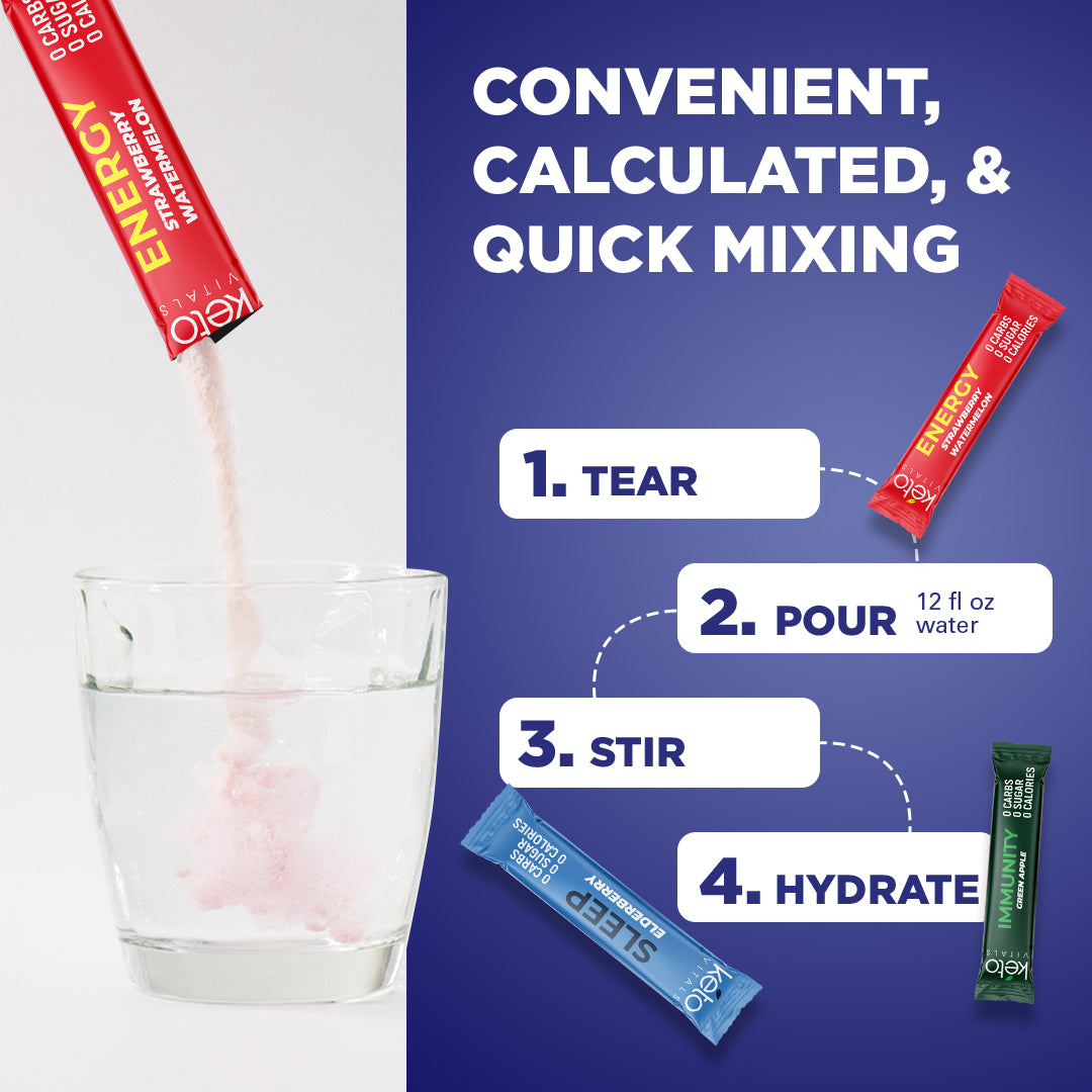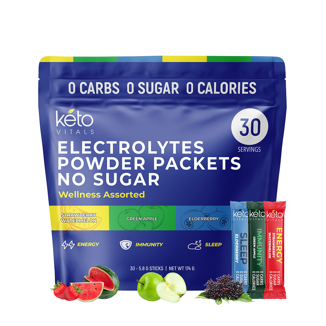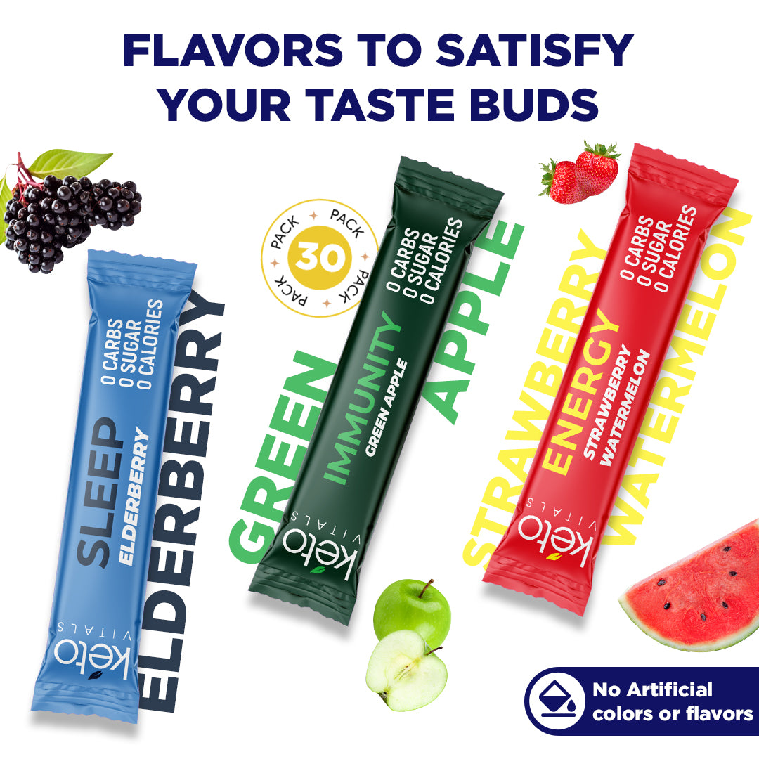 - Delicious and Thirst-Quenching - Your body deserves enhanced electrolytes, vitamins, and minerals to perform at your peak. So, hydrate with KetoVitals’ sugar free electrolyte powder packs. They come in the following fruity flavors: Strawberry Watermelon, Green Apple, and Elderberry.