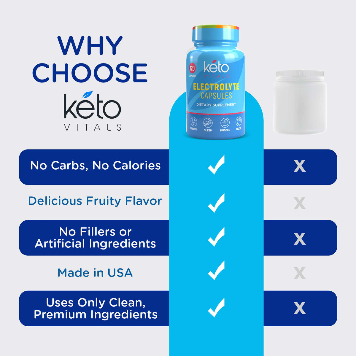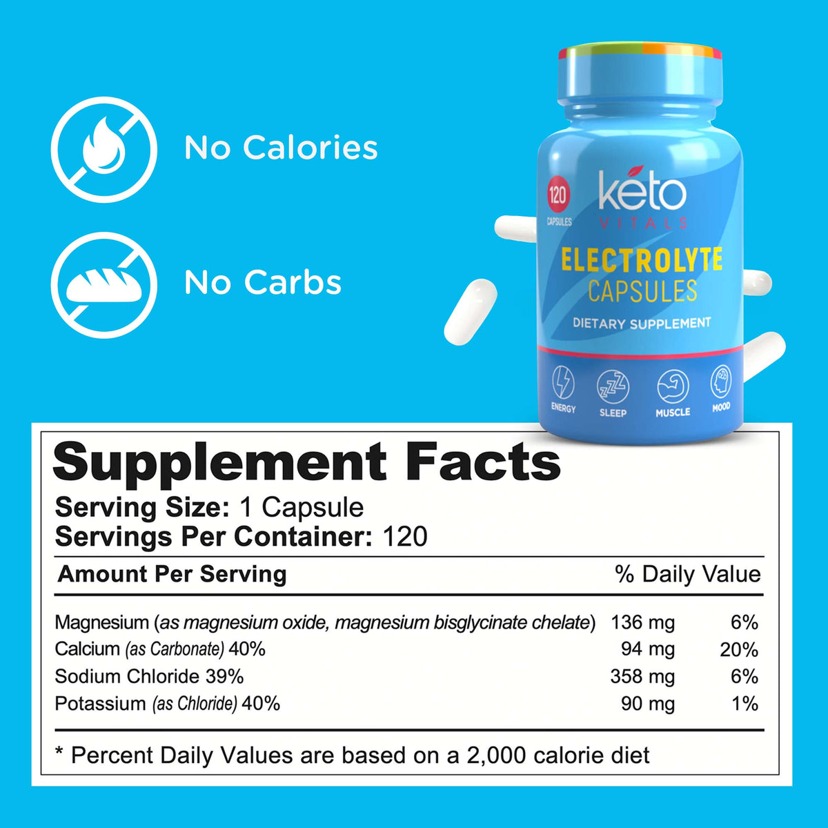 - Boosts Your Energy—Perform at your peak with KetoVitals’ magnesium potassium sodium supplement. By restoring your body’s key electrolytes, our carb-free salt pills with electrolytes help reduce muscle cramps while improving your strength and stamina.